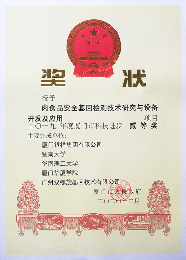 2019年度厦门市科学技术进步奖获奖名单日前出炉,由厦门银祥集团有限公司参与的“肉食品安全基因检测技术研究与设备开发及应用”项目荣获“厦门市科学技术进步二等奖”。