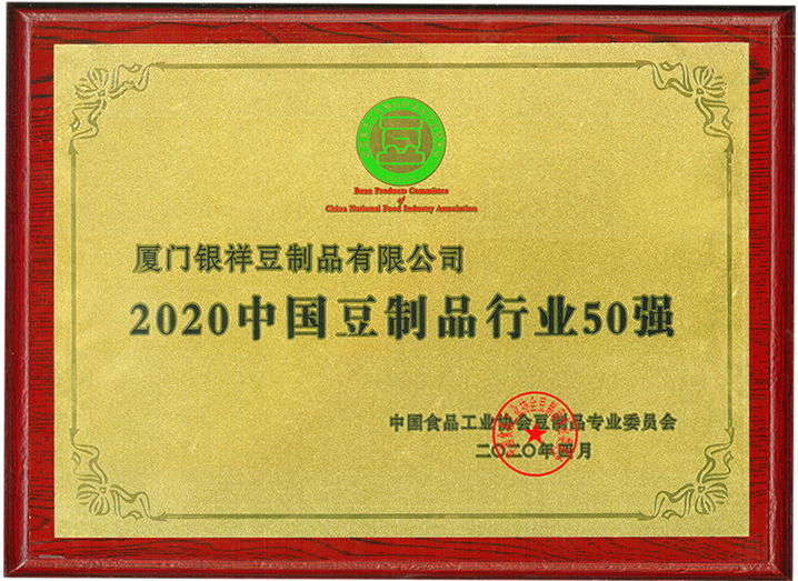 作为中豆委的副会长单位,银祥豆制品不负使命,凭借多年来在豆制品行业稳扎稳打,用心打造安全食品菜篮子工程,突出的业绩和良好的口碑让银祥豆制品再一次获得行业协会的肯定,荣登“2020中国豆制品行业50强”榜单。