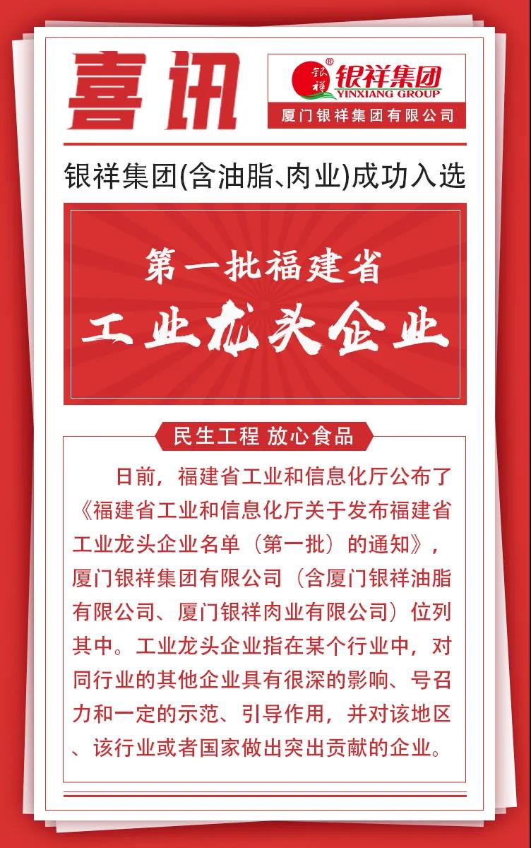 “工业龙头企业”由福建省工业和信息化厅牵头,是对于《福建省人民政府办公厅关于印发福建省培优扶强工业龙头企业引领产业高质量发展行动计划的通知》的贯彻落实,是对企业发展质量和发展水平的省厅级荣誉认证。银祥集团及旗下银祥肉业,银祥油脂作为第一批上榜的工业龙头名单,证明了银祥在食品研发,加工与生产方面的专业与实力,也是对高质量发展,勇担社会责任,创新发展与工业现代化等多方面的肯定。