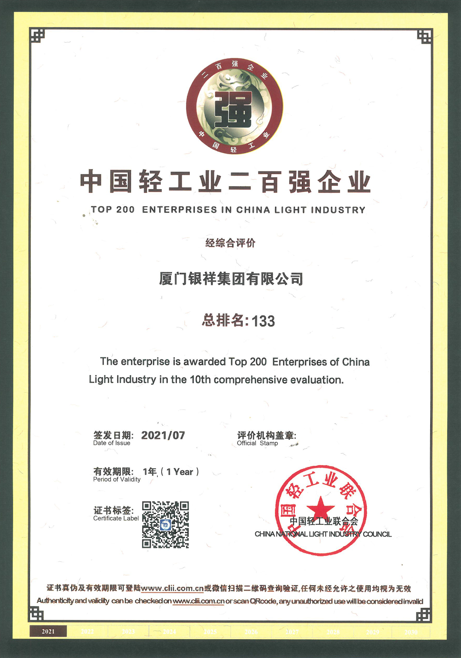 7月20日,由中国轻工业联合会主办、中国轻工业信息中心承办的“奋进十四五·领航新消费”中国轻工业百强企业高峰论坛在北京举行。会上,厦门银祥集团摘得“中国轻工业二百强企业”及“中国轻工业食品行业五十强企业”两项荣誉,分别位列第133位、第40位,企业综合实力获业界认可。