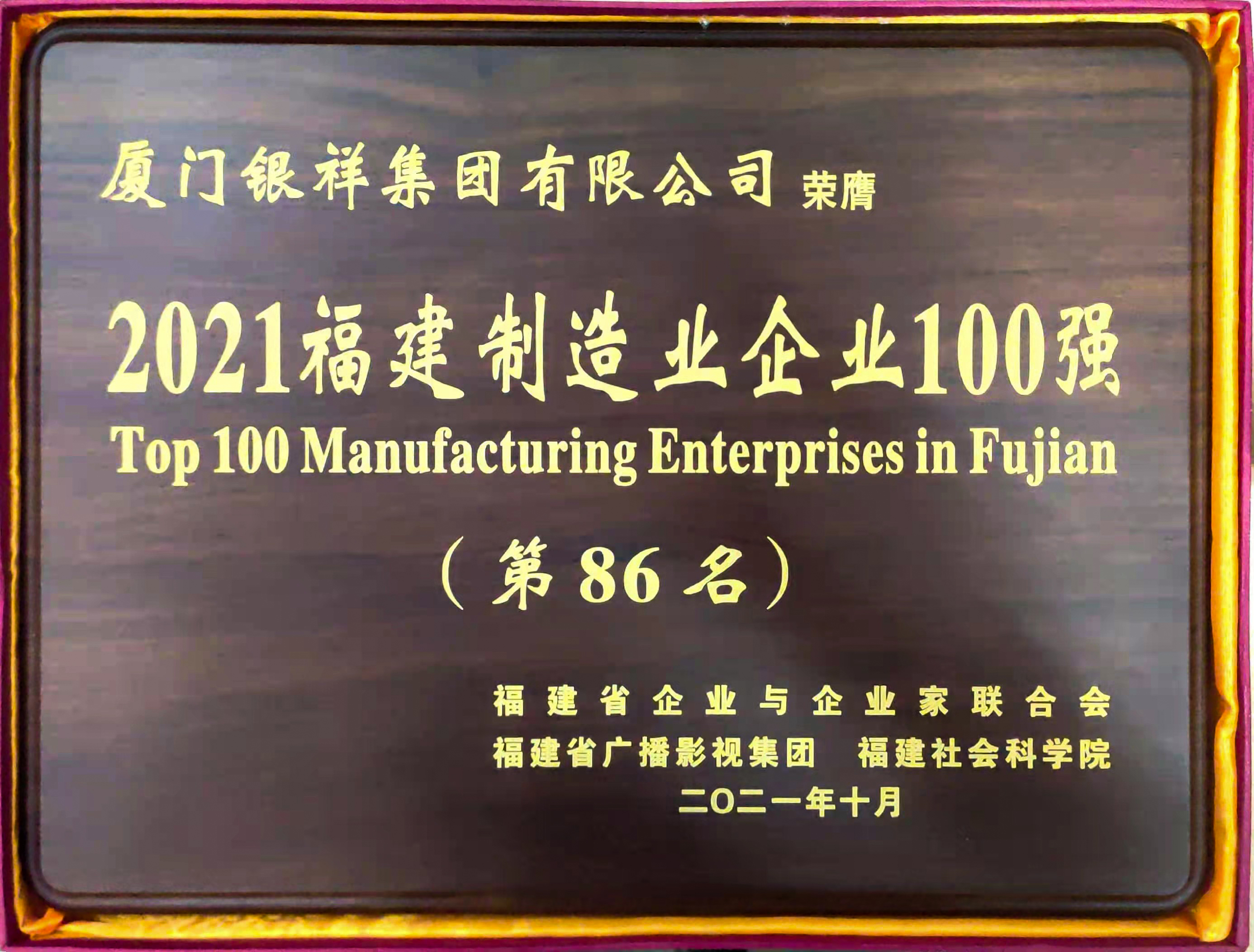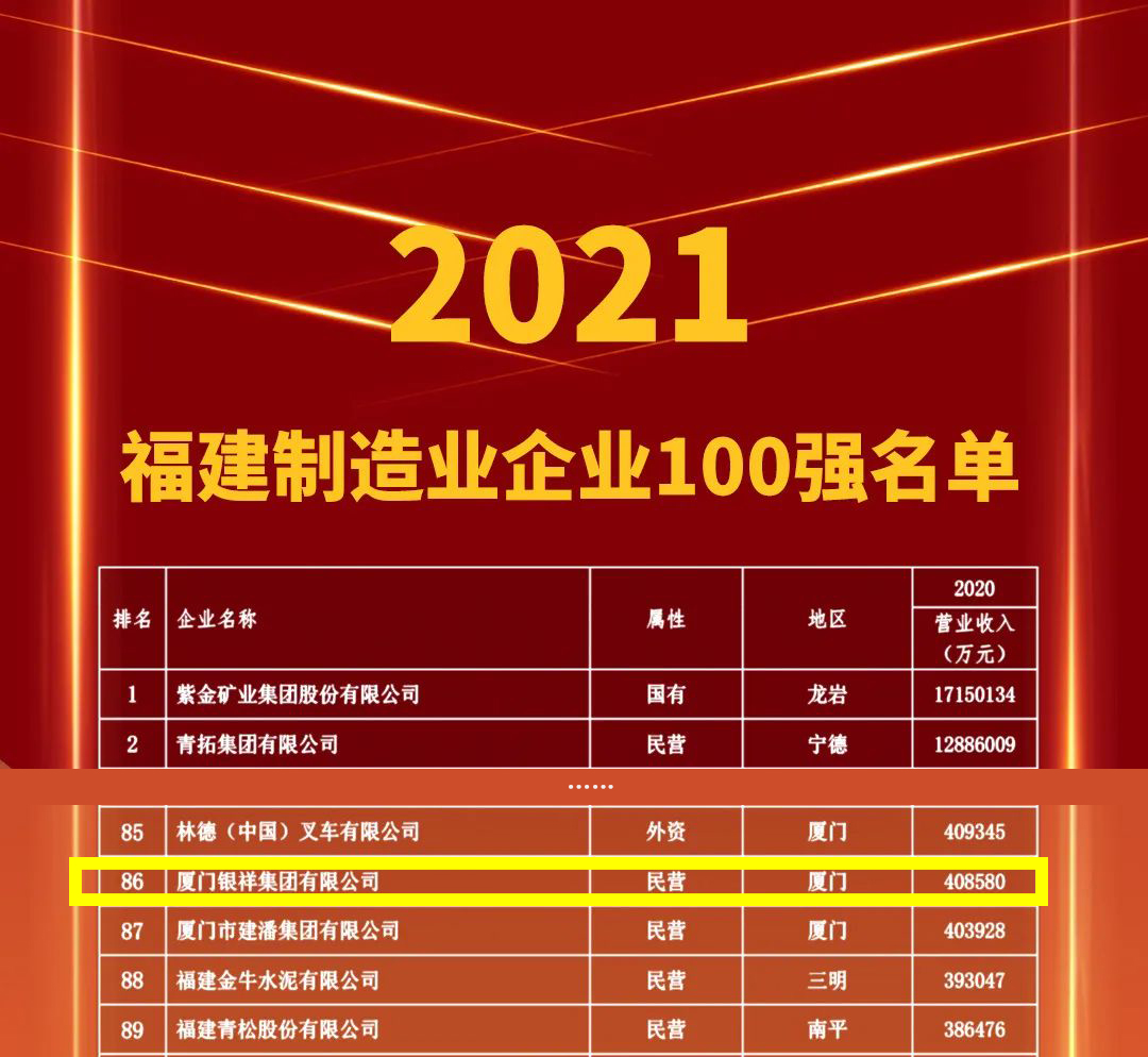 11月3日,2021福建企业100强发布大会暨福建企业家大讲坛在福建会堂举行,会上公布了“2021福建制造业企业100强名单”,银祥集团再次荣登榜单,位列第86名。