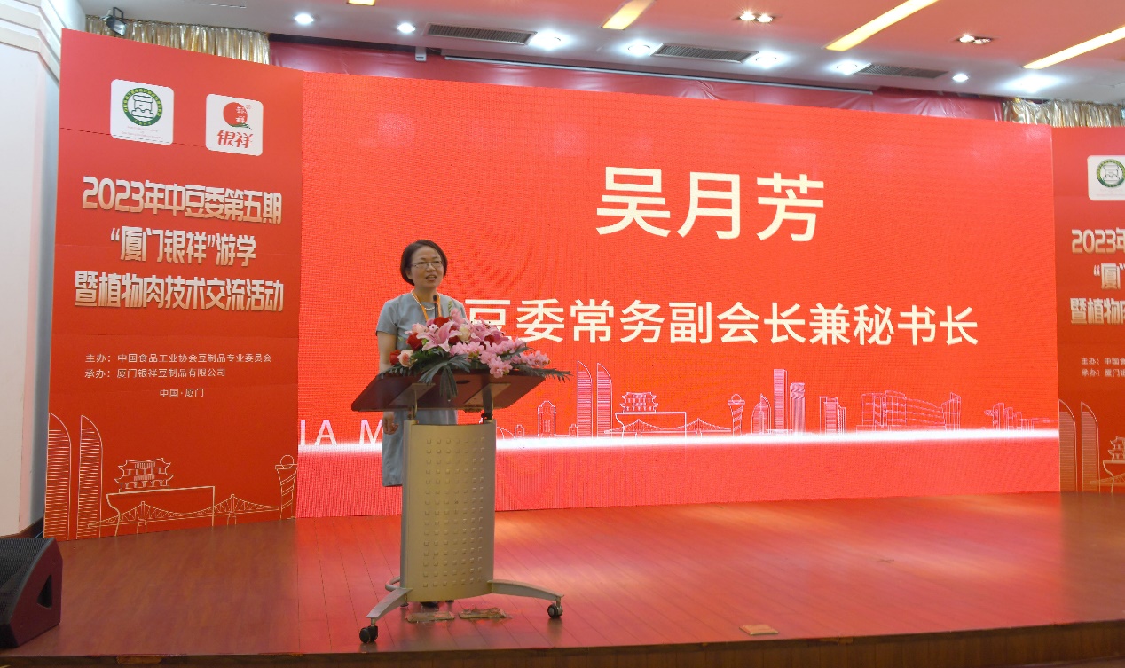 在大豆植物肉技术论坛上,中豆委常务副会长兼秘书长吴月芳致辞总结了这次游学成果,对银祥和好绿盛的盛情接待、敞开交流表示了感谢和肯定。并重点针对豆制品产业和大豆植物肉谈了两点思考: